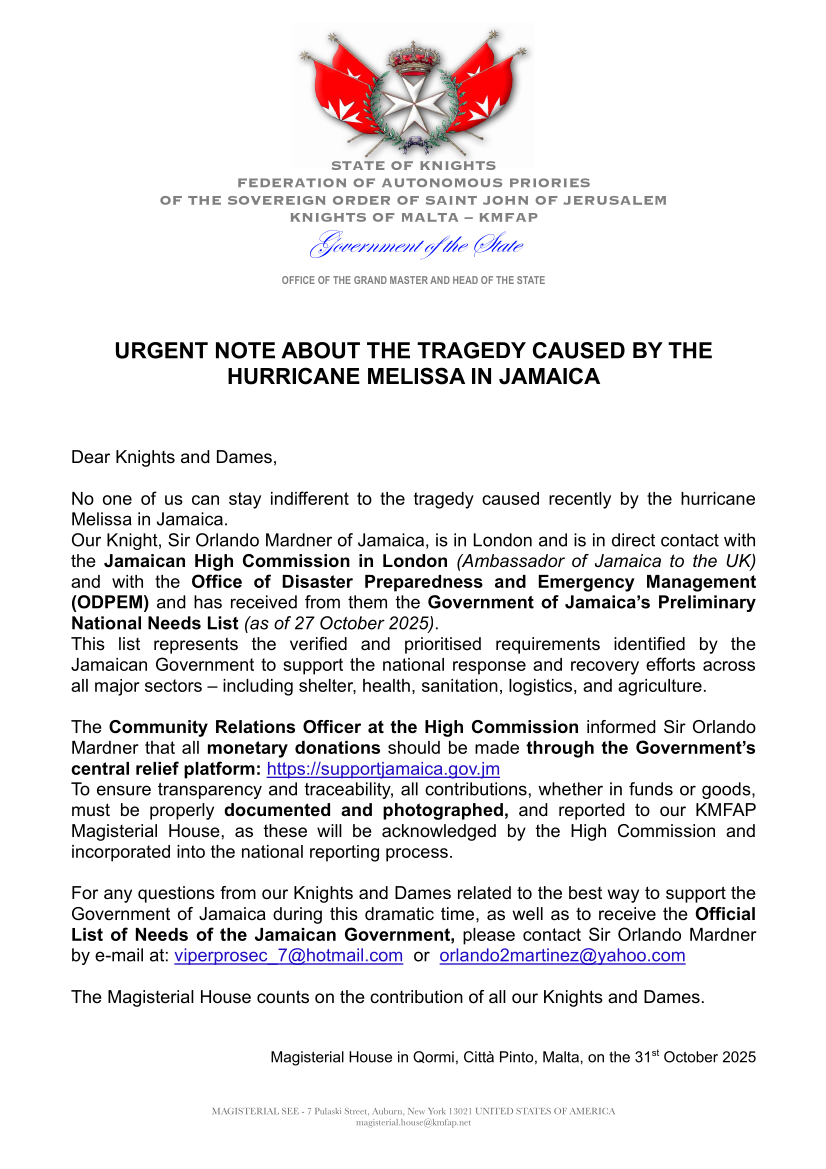 please find here the Urgent Note of the Magisterial House about the tragedy caused recently by the hurricane Melissa in Jamaica.